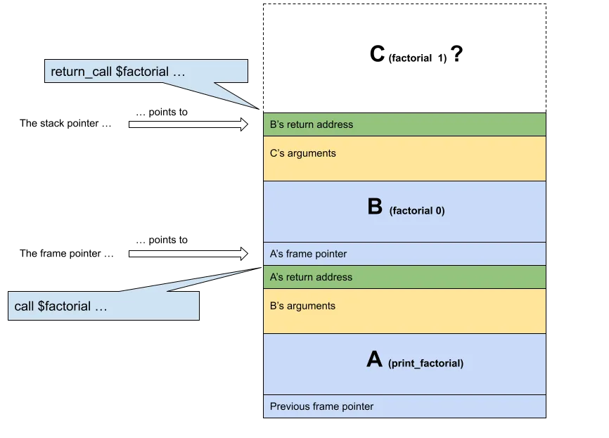 Let’s examine the stack at factorial 1 call site: the first time factorial 0 recursively calls itself. For the sake of simplicity, we will abstract the call chain print_factorial → factorial 0 → factorial 1 to A → B → C.