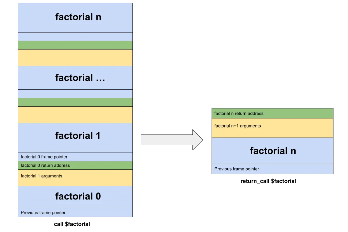 It becomes apparent that with return_call, we only use one frame for factorial and all potential recursions of it.