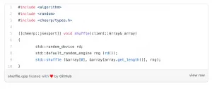 The C++ function has been compiled to JavaScript. You can still recognize what’s happening, there are few casts to integer (to force JavaScript to use 32-bit integers instead of 64-bit floating point math), a loop, a modulo calculation, a swap. Basically the original algorithm has been translated into JavaScript syntax.